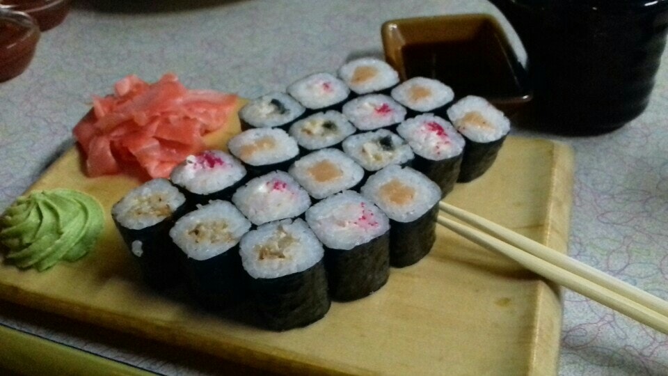 Теплый ролл Филадельфия вкусный, караоке 900 руб. за комнату в час, комната всего одна, 2 микрофона